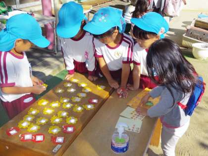 5歳児そら組の子どもたちが、「お名前教えてください」と、名札を渡したり、「シール、ここに貼ってね」と、シールを貼る箇所を知らせたりするなど、受付のお手伝いをはりきってしていました。