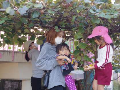 一緒に遊んだあと、たくさん実ったキウイをお家の人と、とって持って帰ってもらいました。うまくとれたかな。バナナやリンゴと一緒に置いていてもらうと、おいしくなるようです。どうでしょうか。また、感想を教えてくださいね。