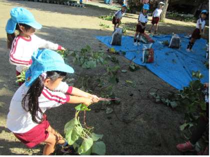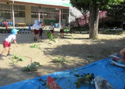 5歳児そら組は、サツマイモのつるの長さに興味をもちました。