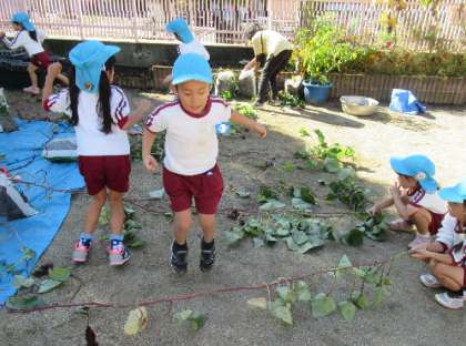 友達と長さを比べたり、並べてあるつるを跳び越えたりしてから、芋ほりをしました。