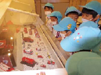 本物の消防車や救急車を見た後は、おもちゃの消防車や救急車、ヘリコプターなどがずらりと並んだケースを見せてもらい、釘付けになっていました。