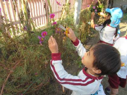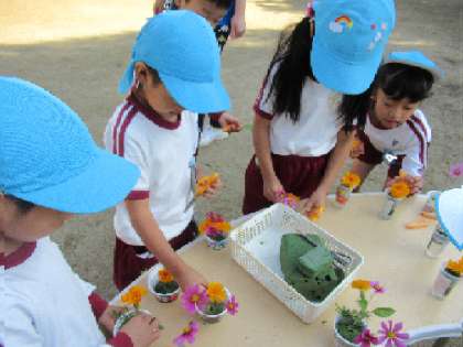 せっかくきれいに咲いている花がまだ少しあるので、5歳児が、花壇の手入れをする前に生け花をしました。カップに入れたオアシスに、摘み取った花を活けていくのが楽しくて、きれいに咲いている花を一生懸命に探していました。