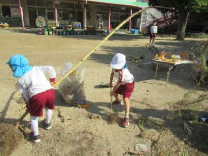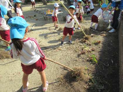 最後は、ヒマワリの根っこを箒にして、後片付けの大掃除。
