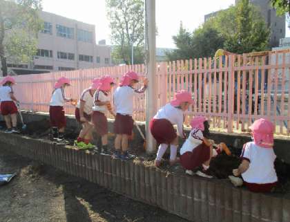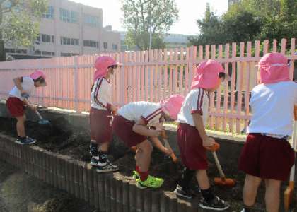 大きくておいしいタマネギを育てるために、土に栄養を入れて、「まぜまぜ〜」と言いながら、土づくりを頑張りました。