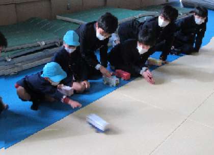 牛乳パックの電車もありました。手で転がすと、勢いよく走るので、中学生と距離を競って遊びました。
