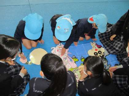 福笑いでは、かわいいキャラクターから好きなものを選んで、目や口を並べて楽しんでいました。