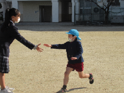 すべての遊びのコーナーを経験し、次はみんなで広い校庭へ。先生の「リレーをします」の声に歓声をあげました。「絶対勝つぞ!」