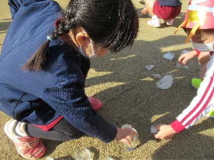 子どもたちが驚いて園庭に出てきました。そりの跡の周りに落ちている氷。そりについていたのでしょうか。「つめたいなあ」「寒いとこから来てくれたからな」など、氷を触りながらつぶやいていました。