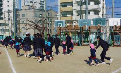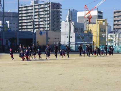 室内で遊んだ後、広い校庭で手をつないで走りました。一緒に走って気持ちよかったですね。