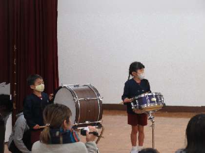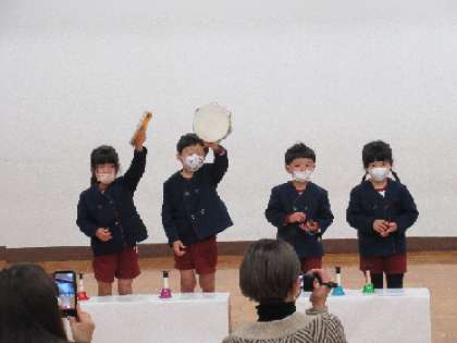 合奏は、少ない人数で、いろいろな楽器を持ち換えながらしました。友達の様子も気にしながら、自分のパートをしっかりと鳴らしていました。終わってから、「なんか、今日は一番じょうずやったな!」「そろってたのがわかった!」「お母さんたちが、かっこいい!って言ってたのが聞こえた」と、友達と心を合わせて合奏することができたという満足感を味わっていました。今日の経験は、子どもたち一人一人の自信や、友達と一緒にやりとげることを楽しみにして活動に取り組もうとする姿に、つながっていくと思います。