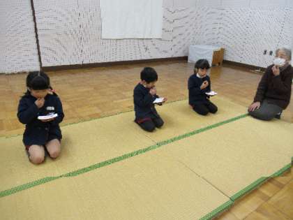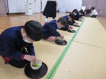 お菓子をいただいた後、お茶を点てました。点てるのは2回目なので、しっかりと手を縦に細かく動かして、きめ細やかなフワフワの泡が出るくらい上手に点てた子どももいました。