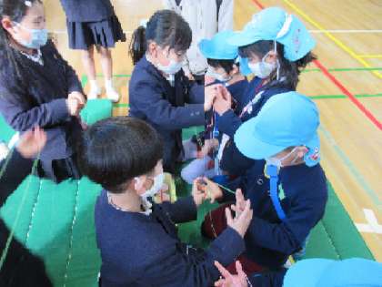 自己紹介してもらったあと、いろいろなコーナーに分かれて遊びました。あやとり、お手玉、めんこ、けん玉、長縄、おはじき、ヨーヨー、コマなど、昔遊びを、1年生が丁寧に教えてくれて、一緒に遊びました。