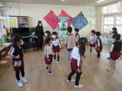ピアノの音をよく聞いて、「立つ音、座る音、どう違うかな」と考えたり、ピアノの音楽に合わせて歩き、音の高低やリズムなどで、自然に「動きが変わったのは、どうして?」と、考えたりしました。「ピアノの音がこっち→(上の方)にいっているのと、こっち←(下の方)にいってるのが違う」「だって小さい音になったから」など、子どもたちなりに考えていました。どんどんお話にひきこまれていっていました。