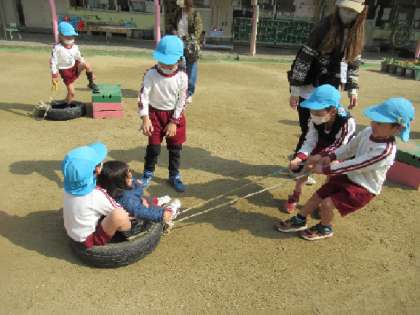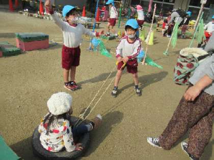 小さい子が遊びやすいアスレチックを考えて、「(巧技台が)もっと低い方がいいんちゃう?」「ケンケンパも喜ぶかも」と、組み立てました。今日は、タイヤ乗り場も登場。それぞれの駅にタイヤを置いて待ち構えて、小さい子が来たら、そっと引いて次の駅まで。次の駅に着いたら、また次のタイヤに乗り換え・・3回タイヤに乗ったらゴールに着きます。喜んで何周もまわっているお客さんもいました。小さくて一人で乗れないときは、一緒に乗って支えてあげるなど、サービスもばっちりです。思いやりをもって、考えたり工夫したりしている姿が頼もしくみえました。