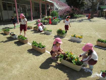 園庭に、花がきれいに咲いているプランターを運んで並べて、枯れている葉っぱを取り、「そら組さん、喜んでくれるかな?」と、すてきな花道をつくってくれました。