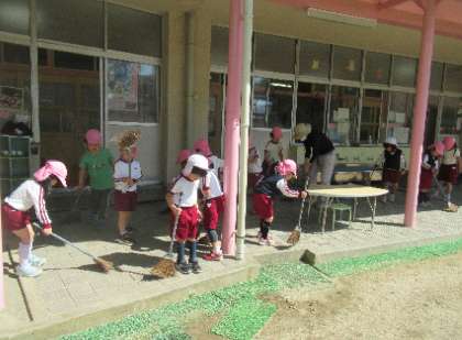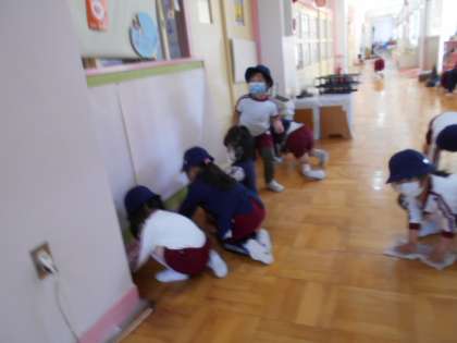 テラスはきれいに掃き掃除、会場になる遊戯室前の廊下は雑巾で拭き掃除。隅々まできれいになりました。いろいろとありがとう。5歳児そら組、明日はがんばります!