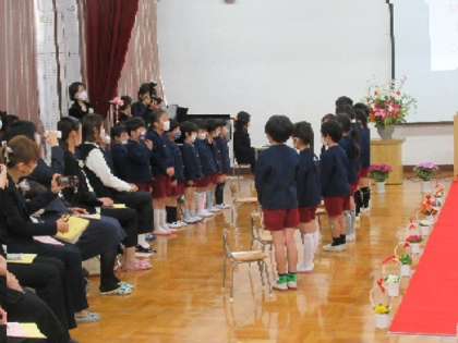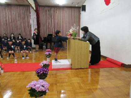 かっこよく入場し、一人ずつ、保育証書をいただきました。演台の前で振り返り、はきはきと「幼稚園で楽しかったこと」や「大きくなったら何になりたいか」など、各々が自分の言葉で、式に出席されているみなさんに話しました。