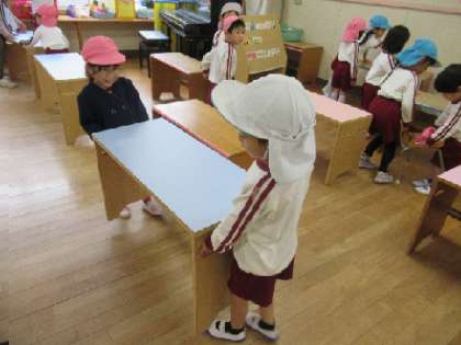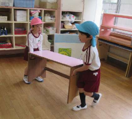 今日は、4歳児はな組の子どもたちも挑戦です。ペアになって、運び方を教えてもらいながら、重い机を慎重に力を入れて運びました。
