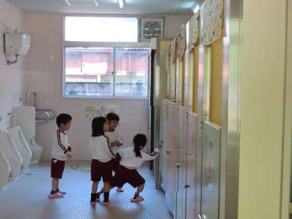 幼稚園の3種類(和式、洋式、男性用)のトイレの写真を見せ、それぞれ誰が使うのかを知らせました。
