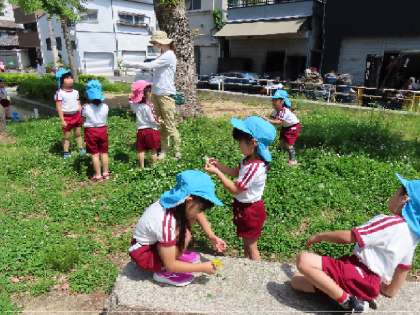 遊具で遊んだり、シロツメクサなどいろいろな草花に触れたり、チョウを追いかけたり、幼稚園と同様、北公園のダンゴムシを見つけたり。