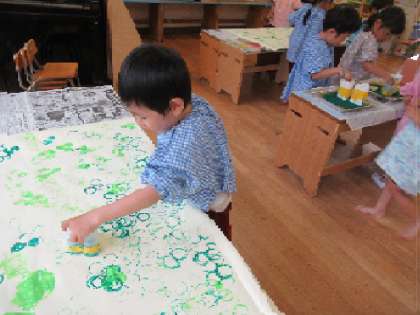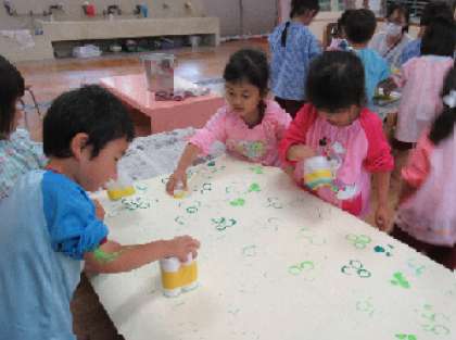 4歳児はな組は、絵の具でスタンプ遊びをしました。紙芯やペットボトルのキャップや乳飲料容器を使って、ポンポンスタンプすると、あら不思議!近隣の公園で見たクローバーや園庭の草むらみたいになりました。「この中に、何の虫がいるかな〜?」と、イメージを膨らませながら、たくさんスタンプしました。