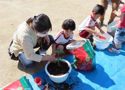 その後も、登降園時にお家の方と一緒に、しゃがんで様子を見たり、水をやったりしています。お家の方も興味をもって関わってくださることで、子どもたちは、更に興味や愛着をもって、野菜の生長を見たり、世話をしたりしています。