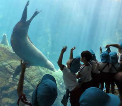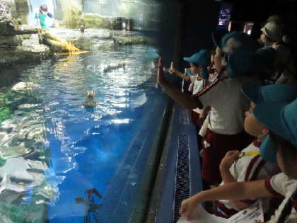 ペンギンやアシカたちが餌を食べる様子に興味津津。カラー帽子を振ると、それを見つけてやってきてくれるアシカたちとは、なんだかふれあっている気分です。