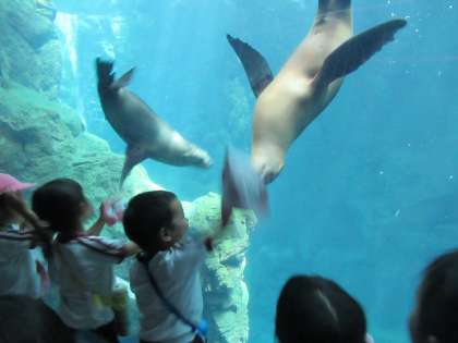 すぐ近くを泳ぐイルカや大きなエイやサメ。集まってくるアシカたち、きれいなクラゲなど、時間が足りないほど、よく見ていました。