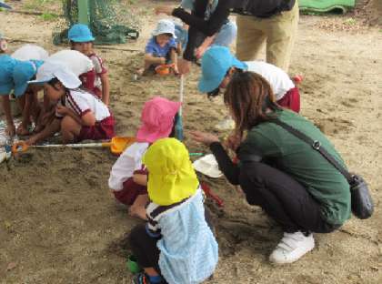 帰りには、園庭にたくさん実っているビワを3つずつ、年長児が「またきてね」の言葉と共に、おみやげに渡しました。