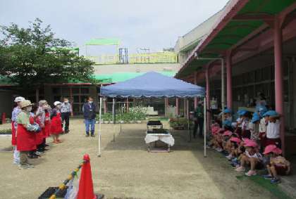 お礼に幼稚園でたくさんできているビワをプレゼント。「お花を植えるのを教えてくれてありがとうございました」「また、来てね」「気を付けて帰ってね」など、自分で考えたことを話していました。