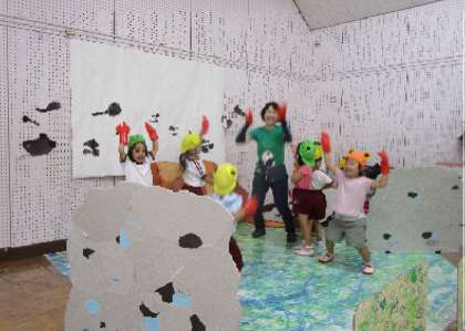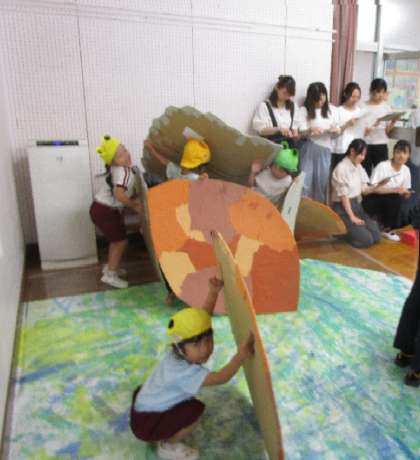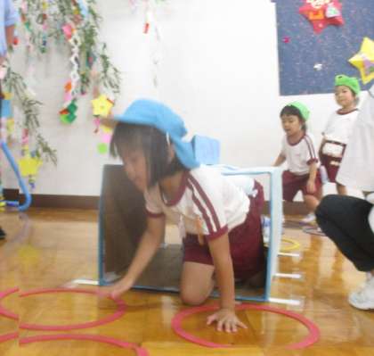 ザリガニのハサミをつけて、『ザリガニチョッチン』のダンスをしたり、魚のトンネルを通ったり、かくれんぼをしたりして遊んでいます。