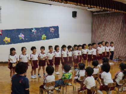 その後、4歳児はな組が『みずあそび』を、5歳児そら組が『みずでっぽう』を、前に並んで歌いました。4歳児は、みんなの前で並んで歌うことも初めてだったのですが、うれしそうに『しゅっしゅっしゅ!』と水鉄砲の動きで遊びました。5歳児はさすがです!並び方もかっこよく、きれいな声で元気よく歌い、4歳児も「お〜!」ときいていました。