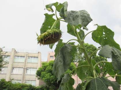 7月に空に向かってびっくりするくらい高く咲いていたヒマワリが、あら?下を向いていますよ。どうしてかな?