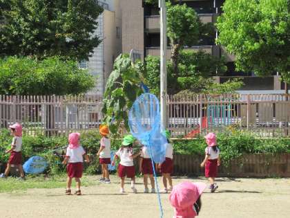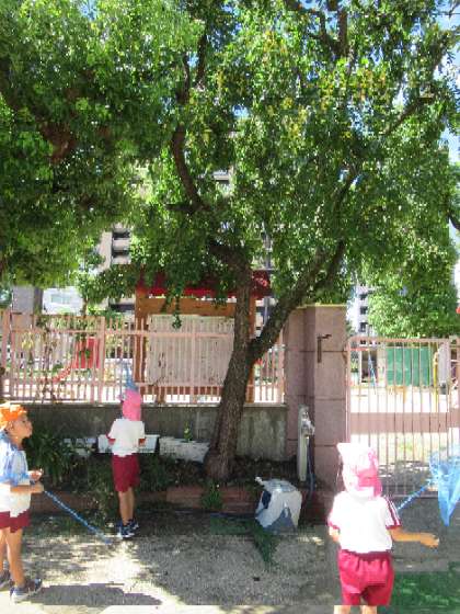 ヒマワリの花の部分が下を向いているのを見て、「こんなんなってる!」と、自分の頭を下げて表現してみたり、地面に落ちていたナツメの実を見つけて、ナツメが木にたくさんなっているのを発見したりしました。