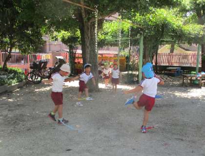 縄を使って、いろいろな遊び方ができることを知り、友達と見せ合いながら、遊んでいました。「一緒にやろう」「だれが長くできるか、みんなでやってみよう」と、声を掛け合っていました。やっぱり、友達と一緒が楽しいね。
