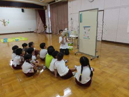 園内や町の危ない場面のイラストや絵本を見せながら、「どこが危ないのか」こうすれば「どうなるのか」などを、子どもたちと一緒に考えました。子どもたちはよく分かっている様子でした。