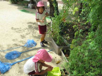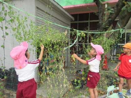 2学期に入り、園庭でいろいろな種を見つけました。フウセンカズラの種は、ハートの模様でかわいいので、夢中でとりました。「風船の中がお部屋になってる」「ぼくのは4つも入ってる!大当たり!」など、友達や教師と、気づいたことや思いを伝えていました。