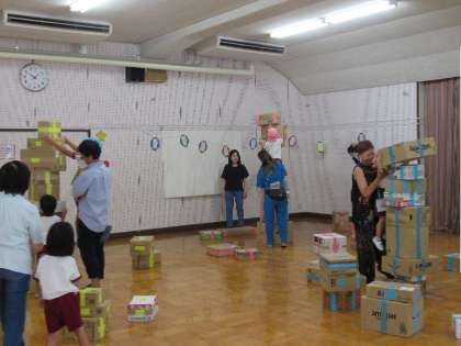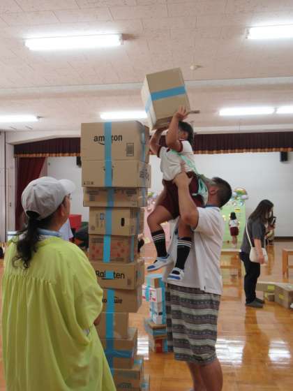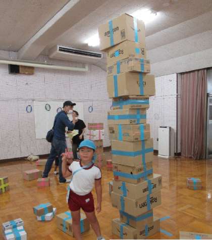 まずは、いろいろな大きさの箱を、お家の方と力を合わせて高く積んでいく箱積み。
