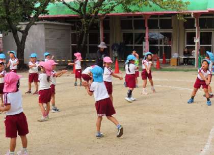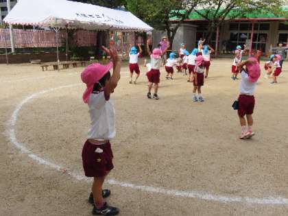 体操とかけっこです。体操では、いろいろな動物になって動きます。キリンになっているのかな。楽しみ、歌いながら体操をしている姿があります。