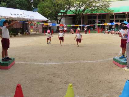 はなぐみにとっては、初めての運動会。全力で走るのは、実はなかなか難しいことです。でも、普段の遊びの中で、何度もおいかけっこや、かけっこを楽しんでいるうちに、全身を使って、思い切り走るようになってきました、その子どもなりに、心地よさを感じるようにもなってきています。