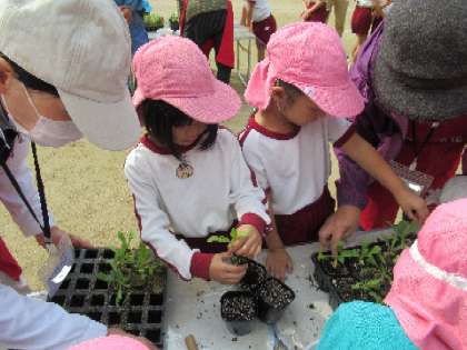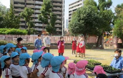 いろいろな大人の方に関わっていただき、その方々への親しみを感じながら、草花の生長に興味をもったり、大切にしたりする気持ちも育まれています。お礼に、幼稚園でとれたキウイと柿をプレゼントしました。