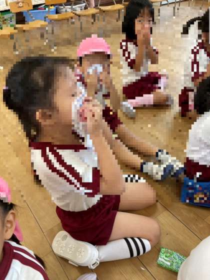 その後、咳やくしゃみが周りの人にかかると、風邪ばい菌が移るということから、咳エチケットの大切さについて話をしました。子どもたちからは、「マスク、つける」「手で押さえる」と返ってきてよく分かっている様子でした。最後に、鼻水が出た時の鼻のかみ方について、絵本を活用して一緒に確認しました。絵本の登場人物、「ティッシュの神様」が教えてくれたように、実際に鼻をかむことにも挑戦!全員、上手に鼻をかむことができました(^^)/
