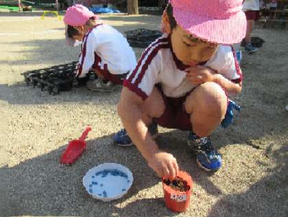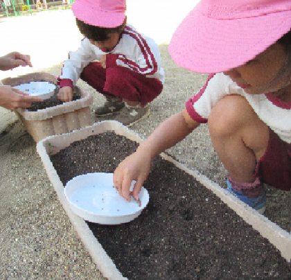 「こんなに小さいの!?」「めっちゃちっちゃい!」と、指でつかむのも難しいくらいの小さな小さな菜の花の種。カブ、はつか大根、スナップエンドウ、グリーンピースと、いろいろ植えていくと、種の大きさや形にも興味をもちました。最後はそら豆!あまりの大きさに「でかっ!」「これどうやって植える?」「めっちゃ大きい穴掘らなあかんな」「見て、めっちゃ大きい穴!ちょうどいい!」など、種の大きさに合わせて、植え方も工夫していました。