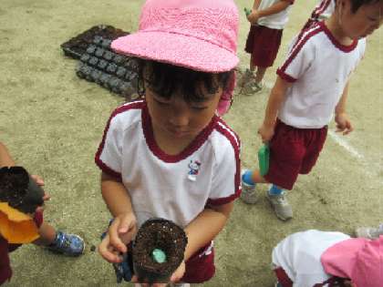 種花事業で、水やりも優しくすることを教わったので、勢いよくかけないように、しゃがんで優しく水をかけていました。経験が生きていますね。大きくなっていくのが楽しみです。