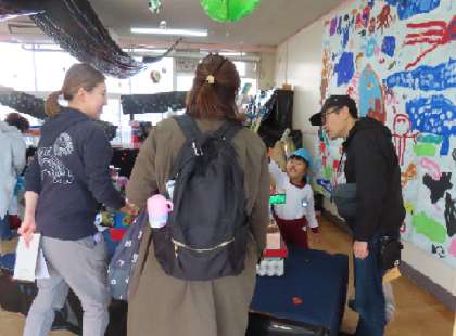 子どもたちが、自分の作品について、お家の方に話しています。お家の方々も、「これ、すごいね」「へえ、〇〇なんだね」など、言葉を返してくださっていて、みんなとてもうれしそうでした。