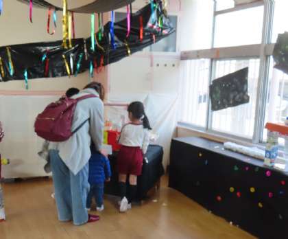 一人一人「これ見て」と誘い、自分の作品について説明していました。「〇〇つくったの?すごいね」と、褒めていただき、自信満々で説明していた子どもたちは、とてもうれしそうです。見ていただけてよかったね。