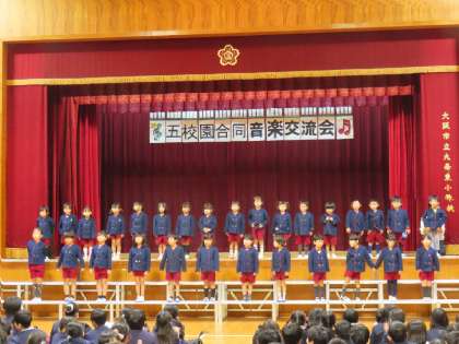幼稚園は、『まつぼっくり』『こどもがみんなわらってる』『おおさかうまいもんのうた』を歌いました。『まつぼっくり』で会場のみなさんとかけあって歌い、とても楽しかったそうです。『おおさかうまいもんのうた』の最後のポーズも決まり、拍手をいっぱいもらって喜んでいました。最後は西中学校吹奏楽部の演奏に心が弾み、思わず音楽にのって踊っていました。