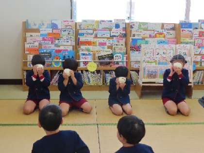 お茶を出してもらったお客様は、隣の人に「おさき」と声をかけ、隣の人は「どうぞ」と返します。お茶を飲んでみたら、今日も「おいしかった!」そうです。