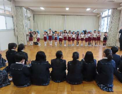お礼に、『まつぼっくり』を歌い、かけあいで歌ってもらいました。そして、聴いてもらいたかった『こどもがいっぱいわらってる』も歌いました。ポーズも一緒にしてもらってうれしかったね。