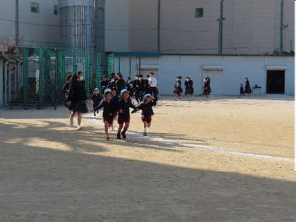 校庭に出て、リレーのあと、「もっと走りたい!」と、トラックを全速力で一周!優しい中学生の配慮により、「一番やったー!」「お兄ちゃん、抜かしたー」など大喜びの子どももいました。ハーハー言いながら「広いなー」とつぶやき、満足そうでした。